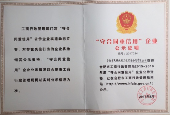 近日,合肥市工商行政管理局頒發(fā)了市級(jí)守合同重信用公示證書,合肥市天秤水利工程質(zhì)量檢測(cè)有限公司首次申報(bào)并獲得此項(xiàng)殊榮。 天秤公司在發(fā)展過程中一直注重于提升企業(yè)的社會(huì)影響力,日益健全合同信用管理體系,完善并規(guī)范...