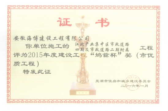 2016年2月2日,蕪湖市建筑業(yè)協(xié)會(huì)于市住建委大樓召開(kāi)建筑業(yè)協(xié)會(huì)常務(wù)理事會(huì)暨工作交流會(huì);會(huì)上,蕪湖市建委向榮獲2015年“鳩茲杯”獎(jiǎng)的單位頒發(fā)了獲獎(jiǎng)證書(shū)及獎(jiǎng)杯,我單位承建的“江北產(chǎn)業(yè)集中區(qū)市政道路四...