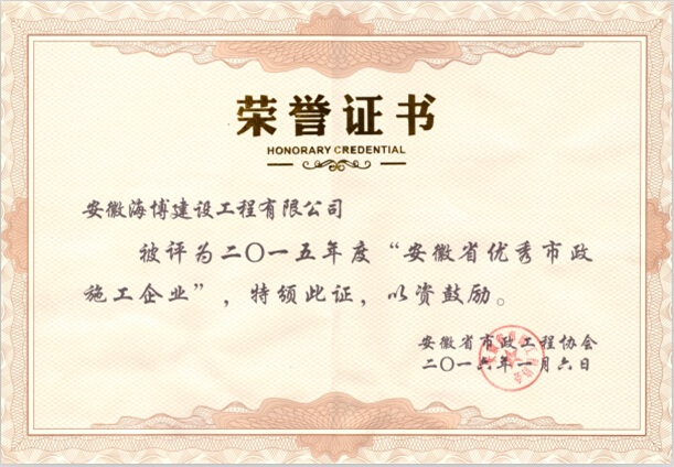 2015年度“安徽省優(yōu)秀市政施工企業(yè)”評(píng)選結(jié)果于近日揭曉,此次全省共評(píng)選出40家優(yōu)秀市政施工企業(yè),熱烈祝賀安徽海博建設(shè)工程有限公司位列其中。 目前,安徽海博建設(shè)工程有限公司與...