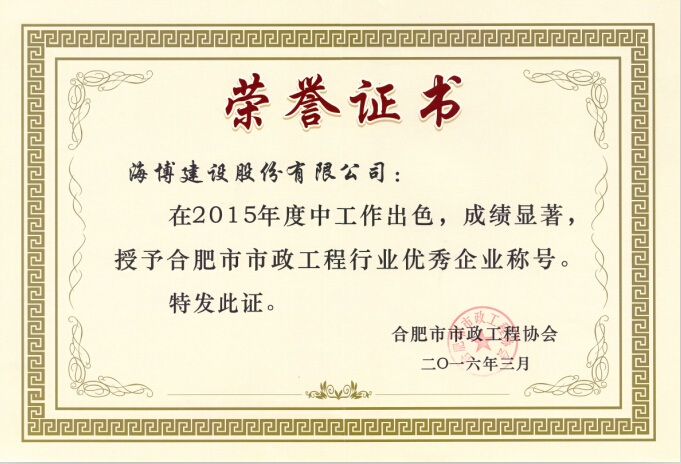 合肥市市政工程協(xié)會(huì)第三屆三次理事大會(huì)于昨日召開(kāi),會(huì)上對(duì)2015年度評(píng)選出的合肥市市政工程“優(yōu)秀企業(yè)”和“優(yōu)秀項(xiàng)目經(jīng)理”進(jìn)行表彰,海博建設(shè)股份有限公司榜上有名,并且我司李申鋒、郭劍兩位同志也榮獲...