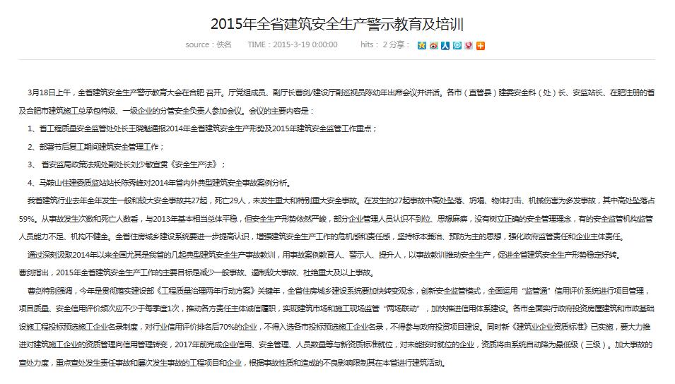 3月18日上午,全省建筑安全生產(chǎn)警示教育大會在合肥 召開。廳黨組成員、副廳長曹劍/建設廳副巡視員陳幼年出席會議并講話。各市(直管縣)建委安全科(處)長、安監(jiān)站長、在肥注冊的省及合肥市建筑施工總承包...