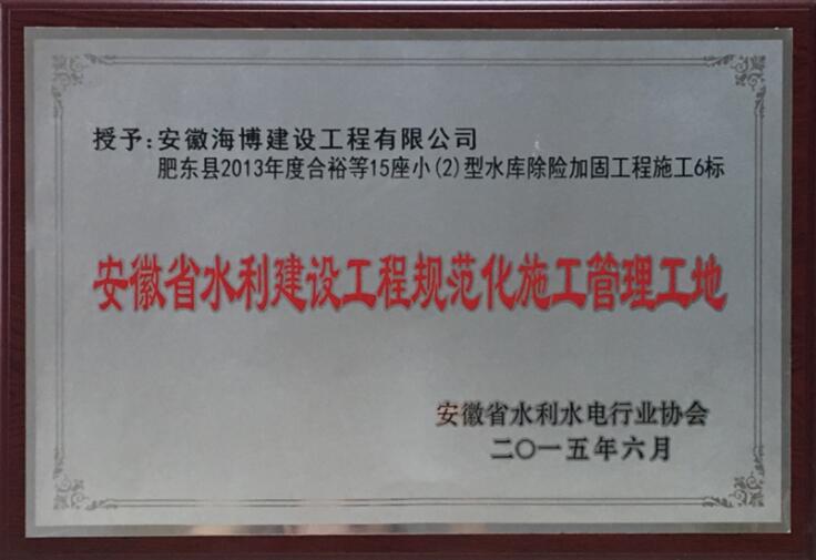 我公司承建的“肥東縣2013年度合裕等15座省級小(二)型水庫除險加固工程6標”獲得 2014年度“安徽省水利建設工程規(guī)范化管理工地”的榮譽稱號。 該工程為省級小(2)型水庫除險加固項...