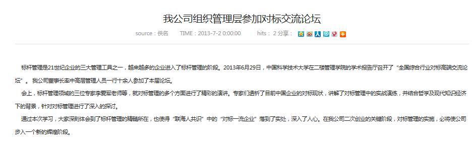標(biāo)桿管理是21世紀(jì)企業(yè)的三大管理工具之一,越來越多的企業(yè)進(jìn)入了標(biāo)桿管理的階段。2013年6月29日,中國科學(xué)技術(shù)大學(xué)在二樓管理學(xué)院的學(xué)術(shù)報告廳召開了“全國綜合行業(yè)對標(biāo)高端交流論壇”。 我公司董事長....