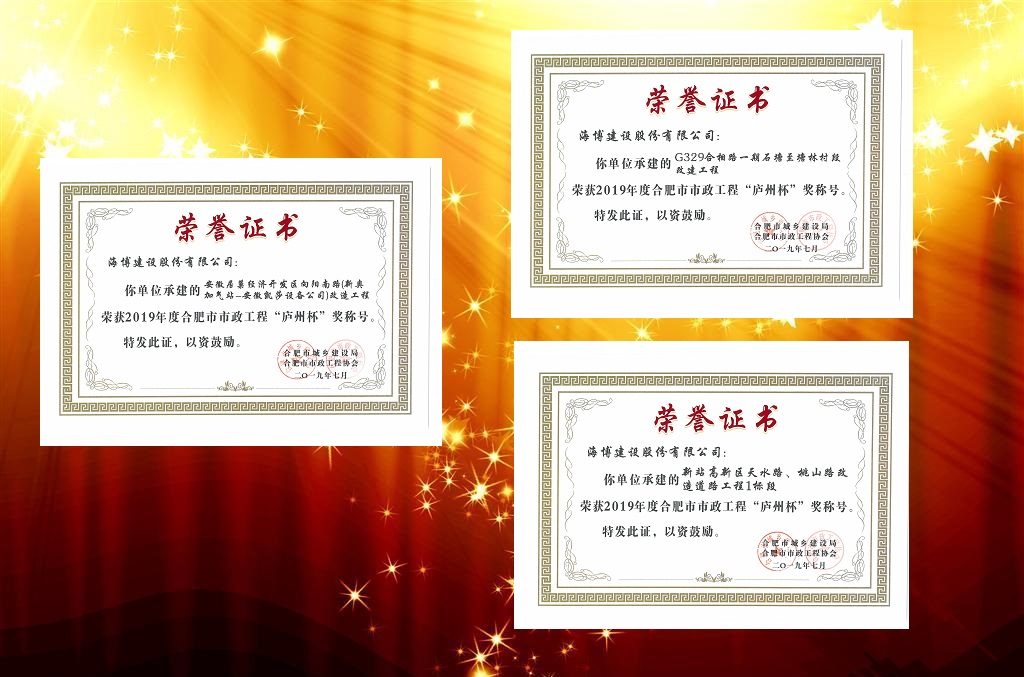 ——賀我公司三項(xiàng)目喜獲“廬州杯” 近日,由我公司承建的G329合相路一期石塘至塘林村段改建工程(總造價(jià)11338萬(wàn)元)、新站高新區(qū)天水路、桃山路改造道路工程1標(biāo)段(總造價(jià)2371萬(wàn)元)及安徽居巢經(jīng)濟(jì)開(kāi)發(fā)區(qū)向陽(yáng)南路改造工程(總造價(jià)1108萬(wàn)元)三個(gè)項(xiàng)目喜獲2019年度合肥市市政工程“廬州杯”獎(jiǎng)稱...
