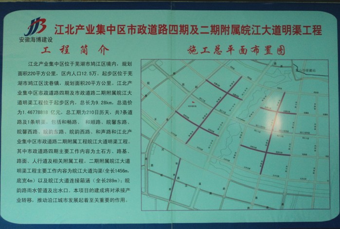 安徽省江北產(chǎn)業(yè)集中區(qū)四期市政道路及二期附屬皖江大道明渠工程位于蕪湖市鳩江區(qū)沈巷鎮(zhèn),工程主要內(nèi)容包括7條道路及1條明渠;道路總長(zhǎng)9.28km,分別為和聲路、和暢路、和順路、皖韻東路、皖韻西路、皖馨東路、皖馨西路;皖江大道明渠工程包括明渠段長(zhǎng)度1456米,箱涵總長(zhǎng)289米,皖韻西路∮1600雨水管247米。工程總造價(jià)1.47億元,工期7個(gè)月。