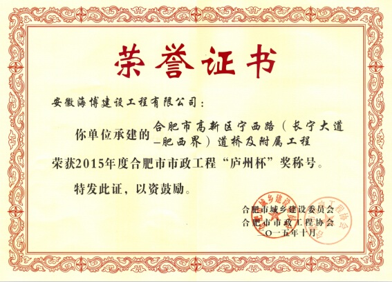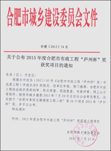 炎炎夏日,驕陽(yáng)似火,我公司喜獲2015年度合肥市市政工程“廬州杯”獎(jiǎng),給酷熱的盛夏送來(lái)了陣陣涼意。由公司承建的合肥市高新區(qū)寧西路(長(zhǎng)寧大道-肥西界)道橋及附屬工程經(jīng)合肥市城鄉(xiāng)建設(shè)委員會(huì)及合肥市市政工程協(xié)會(huì)審定,順利獲得此次獎(jiǎng)項(xiàng)。