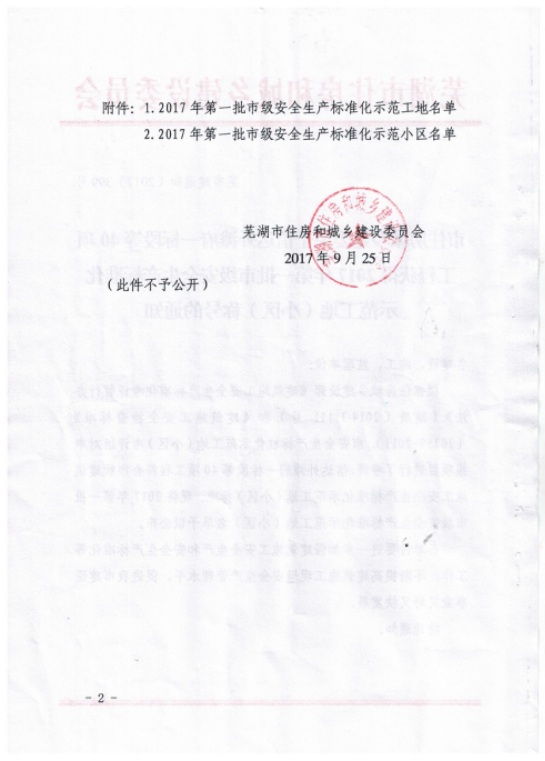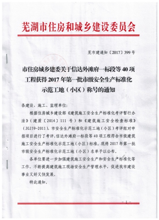 近日,經(jīng)蕪湖市安全辦領(lǐng)導(dǎo)、專家組成的安全標(biāo)準(zhǔn)化評(píng)審組嚴(yán)格、認(rèn)真地評(píng)審,我公司無(wú)為縣城東工業(yè)園區(qū)福東北路(緯一路-福貿(mào)路)工程獲得2017年第一批市級(jí)安全生產(chǎn)標(biāo)準(zhǔn)化示范工地稱號(hào),也是蕪湖市目前唯一獲得該稱號(hào)的市政道路工程。