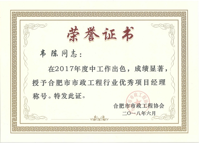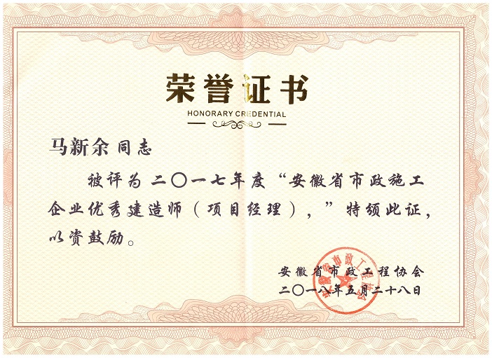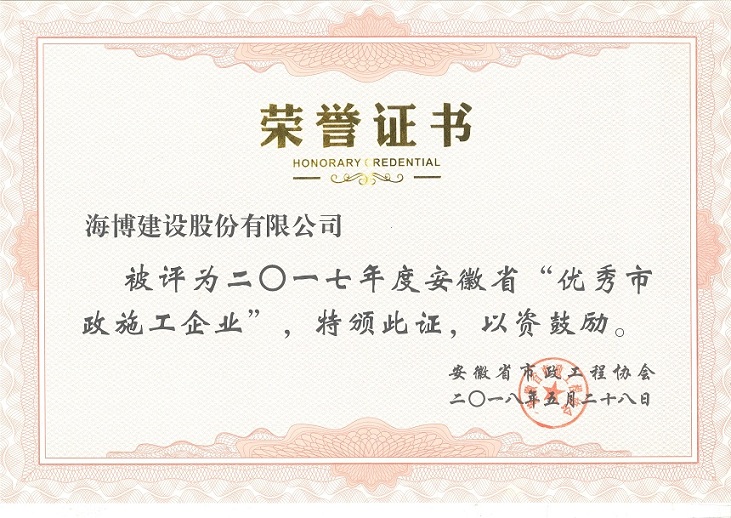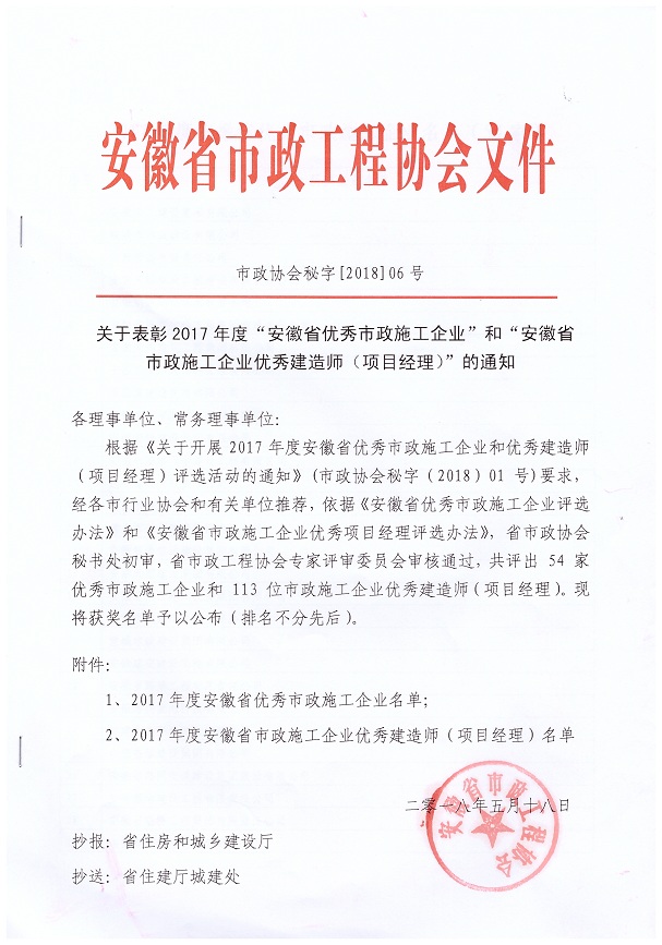 近日,安徽省市政工程協(xié)會(huì)發(fā)布了市政協(xié)會(huì)秘字【2018】06號(hào)文件,文件中表彰了2017年度“安徽省優(yōu)秀市政施工企業(yè)”和“安徽省市政施工企業(yè)優(yōu)秀建造師(項(xiàng)目經(jīng)理)”。經(jīng)過(guò)省市政工程協(xié)會(huì)專家評(píng)審委員會(huì)的層層評(píng)比,我司榮獲2017年度“安徽省優(yōu)秀市政施工企業(yè)”稱號(hào),公司馬新余、周宗兵、趙行東三位同志被授予“安徽省市政施工企業(yè)優(yōu)秀建造師(項(xiàng)目經(jīng)理)”稱號(hào)。