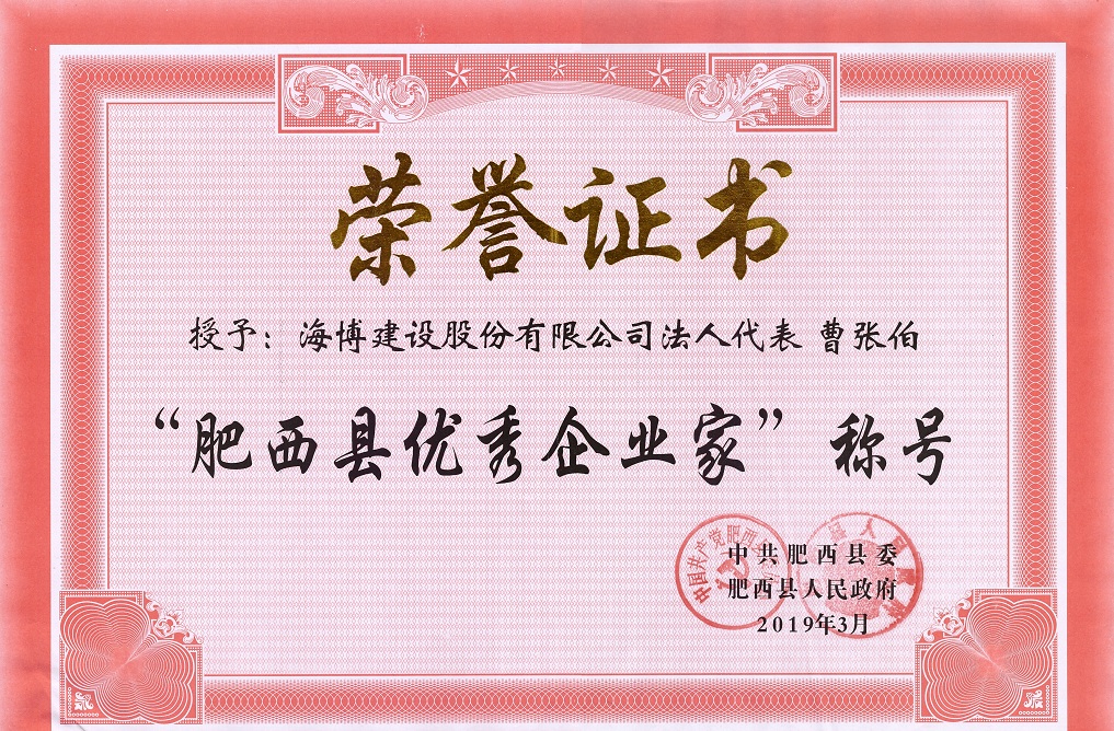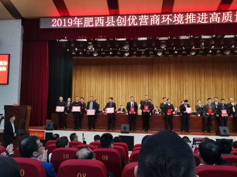 2019年3月30上午9:00整,肥西縣創(chuàng)優(yōu)營(yíng)商環(huán)境推進(jìn)高質(zhì)量發(fā)展大會(huì)在縣政府派河劇場(chǎng)隆重召開(kāi),并舉行了“肥西縣優(yōu)秀企業(yè)”、“優(yōu)秀企業(yè)家”頒獎(jiǎng)典禮。集團(tuán)公司董事長(zhǎng)曹張伯先生獲“肥西縣優(yōu)秀企業(yè)家”榮譽(yù)稱(chēng)號(hào)。