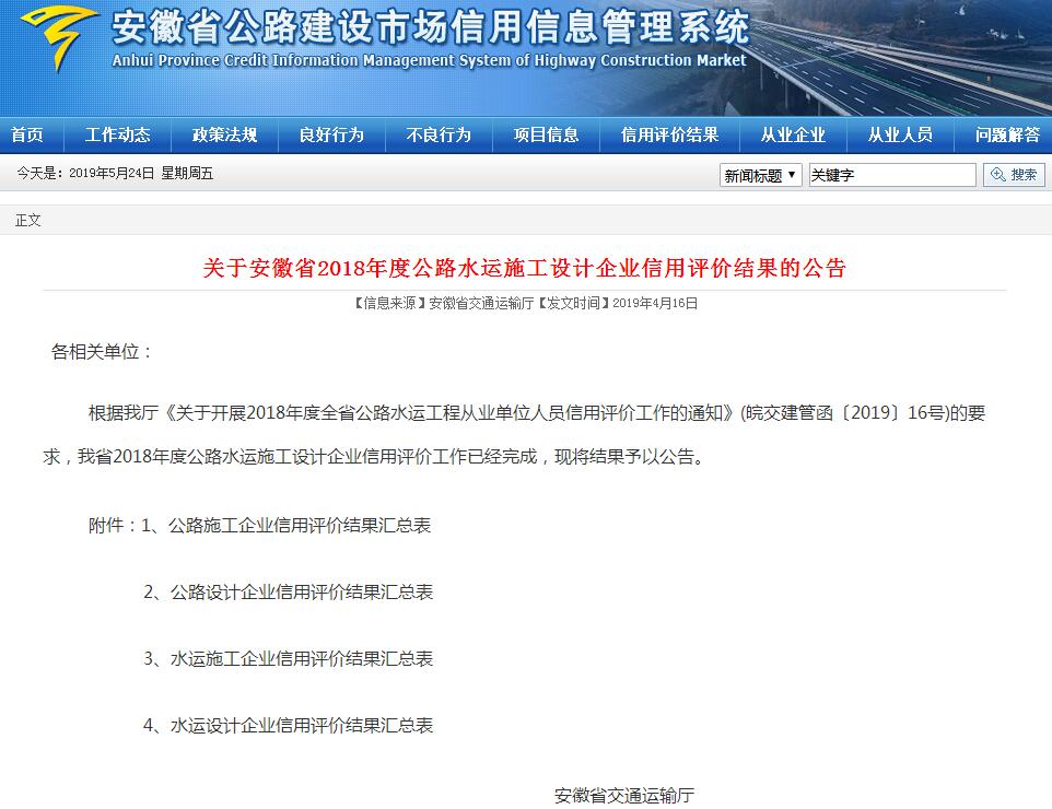 近日,安徽省交通運(yùn)輸廳公告了“安徽省2018年度公路水運(yùn)施工設(shè)計(jì)企業(yè)信用評價結(jié)果”,我公司被評為省級公路施工行業(yè)最高等級“AA”級信用企業(yè)。