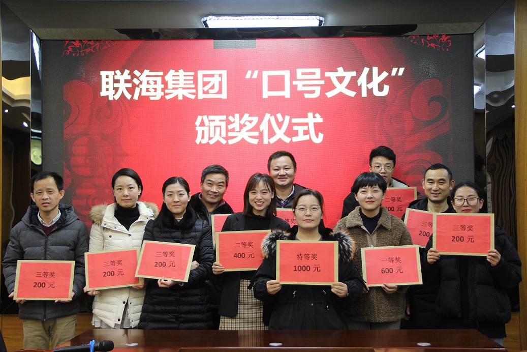 近期,集團公司開展了《關于聯(lián)海集團“口號文化”征集大賽的通知》活動,經過兩次征選、全員投票的方式,評比出特等獎、一等獎、二等獎、三等獎共計11條獲獎口號。并于2019年12月25日下午17:00由發(fā)展戰(zhàn)略執(zhí)行中心組織了頒獎儀式,對獲獎口號的部門給予表彰和現金獎勵。