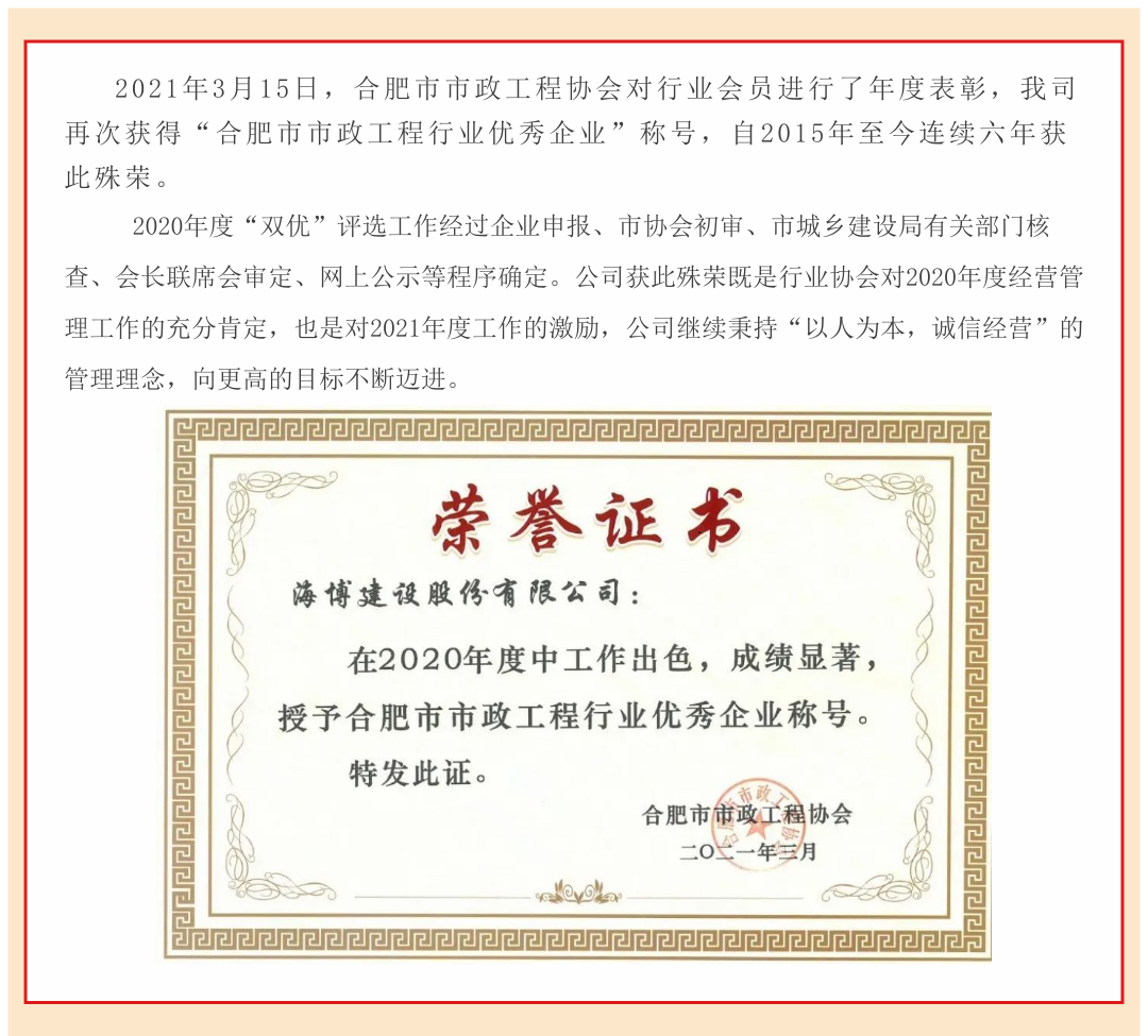 公司再獲合肥市市政工程優(yōu)秀企業(yè)稱號(hào)